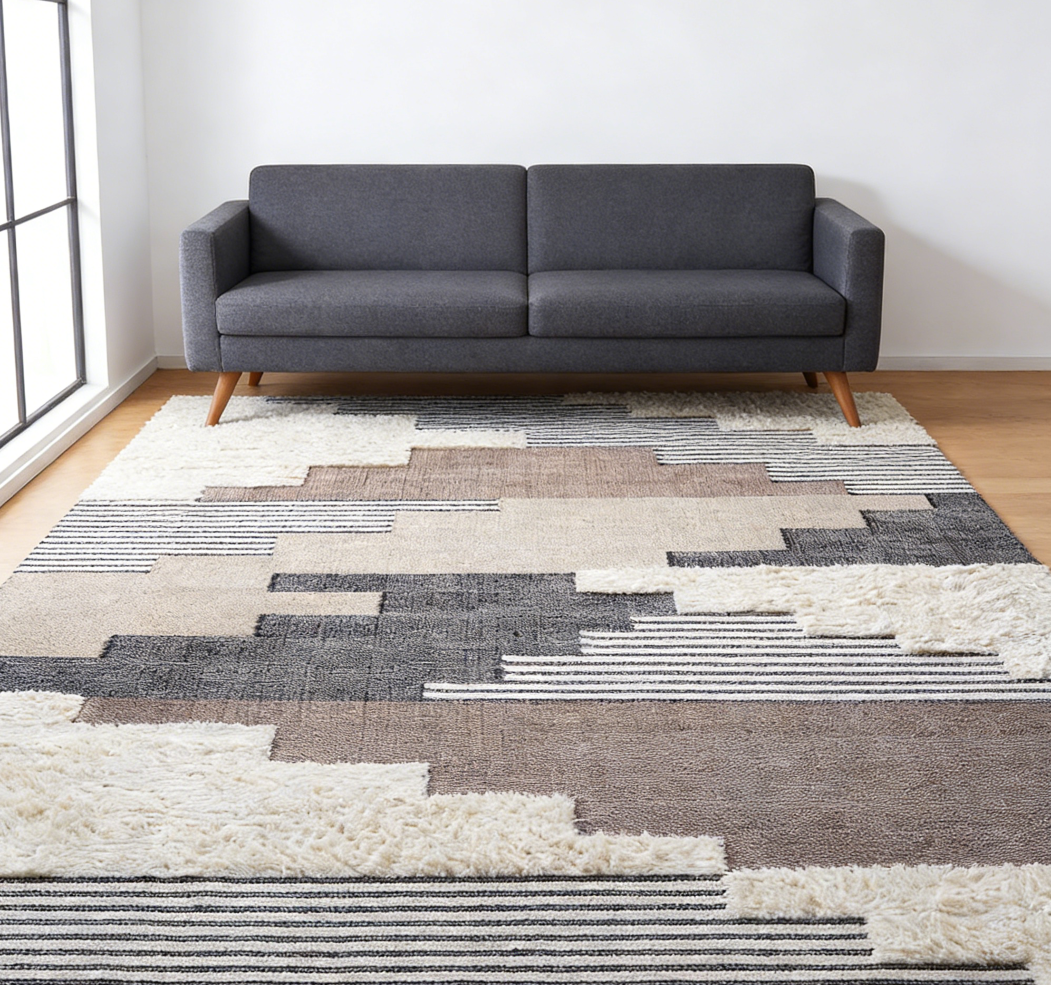 This knitted yarn rug provides a decorative floor covering suitable for interior spaces.